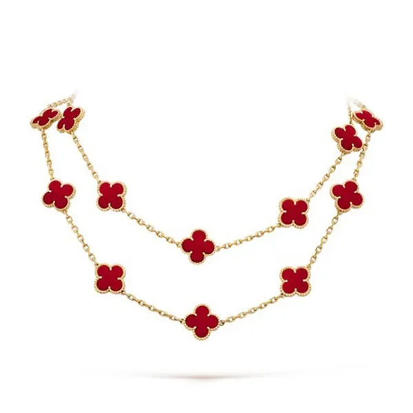 This stunning Clover 20 Motifs Carnelian Gold Necklace showcases intricate clover motifs and vibrant carnelian stones, creating a unique and elegant look. Crafted with precise details and high-quality materials, this necklace is a perfect addition to any jewelry collection. Add a touch of sophistication to any outfit with this luxurious piece.