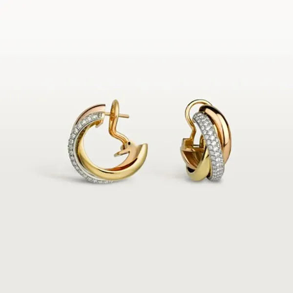 Make a statement with the Trinity Earrings in Pink Gold and Diamond Gold. Crafted from high-quality materials, these earrings boast a unique trinity design that is sure to elevate any outfit. With the added sparkle of diamonds, these earrings are both fashionable and timeless. Perfect for any occasion, these earrings offer a touch of elegance and sophistication.