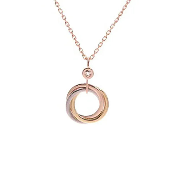 This elegant Trinity Necklace features a combination of silver, gold, and pink gold, creating a stunning and versatile accessory. The unique color scheme adds a touch of sophistication to any outfit. Crafted with high-quality materials, this necklace is built to last and make a statement.